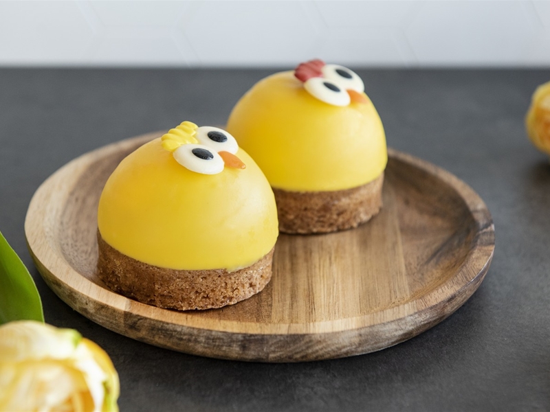 Gebakje met een koekbodem van spijs met daar bovenop een passievruchtbavaroise.