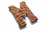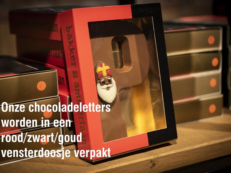 Deze letters, gegoten met de kwaliteitschocolade van Callebaut, zijn gevuld met hele hazelnoten. Ze zijn verkrijgbaar in S en M. Ze worden verpakt in een rood/zwart/goud gekleurd vensterdoosje. Een letter weegt ca. 200 gram