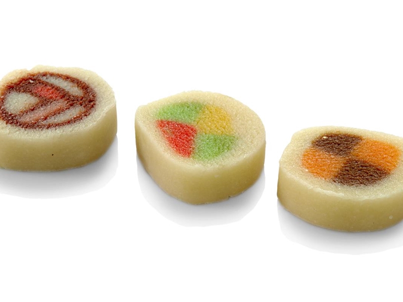 Plakjes marsepein, waarin verschillende kleuren zijn verwerkt. Ze worden verpakt in bakjes van 150 gram. De marsepein is van goede kwaliteit en bestaat uit 1 deel amandelen en 1,5 deel suiker.